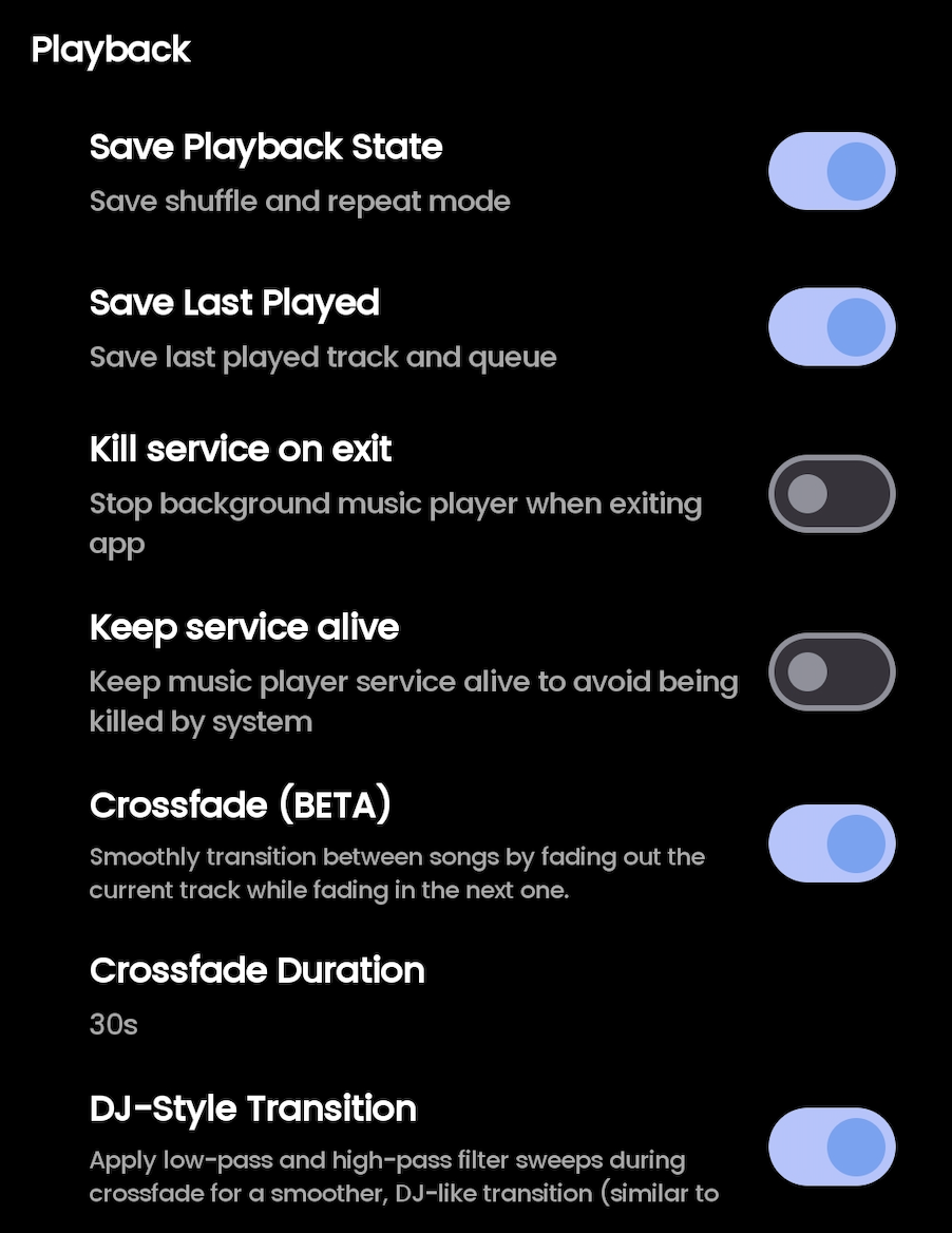 SimpMusic: SimpMusic focuses on a manual, user-controlled transition—your crossfade time is set by you, and the app enhances the overlap with a light DJ-like filter feel (so it’s not only smooth in volume, but also smooth in texture). SimpMusic does not do automatic BPM/pitch matching like fully-automated AutoMix-style systems; instead it gives you a reliable, consistent transition you can tune per your taste.